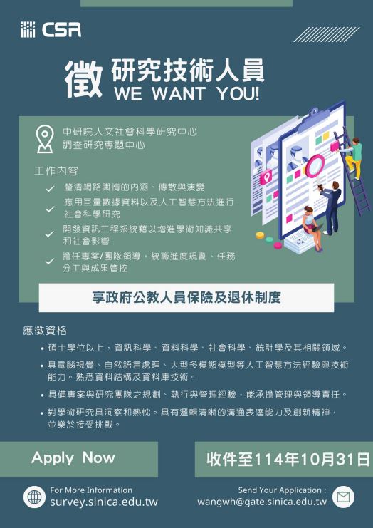 歡迎資訊科學、資料科學、社會科學、統計學及其相關領域碩士學位以上踴躍申請!