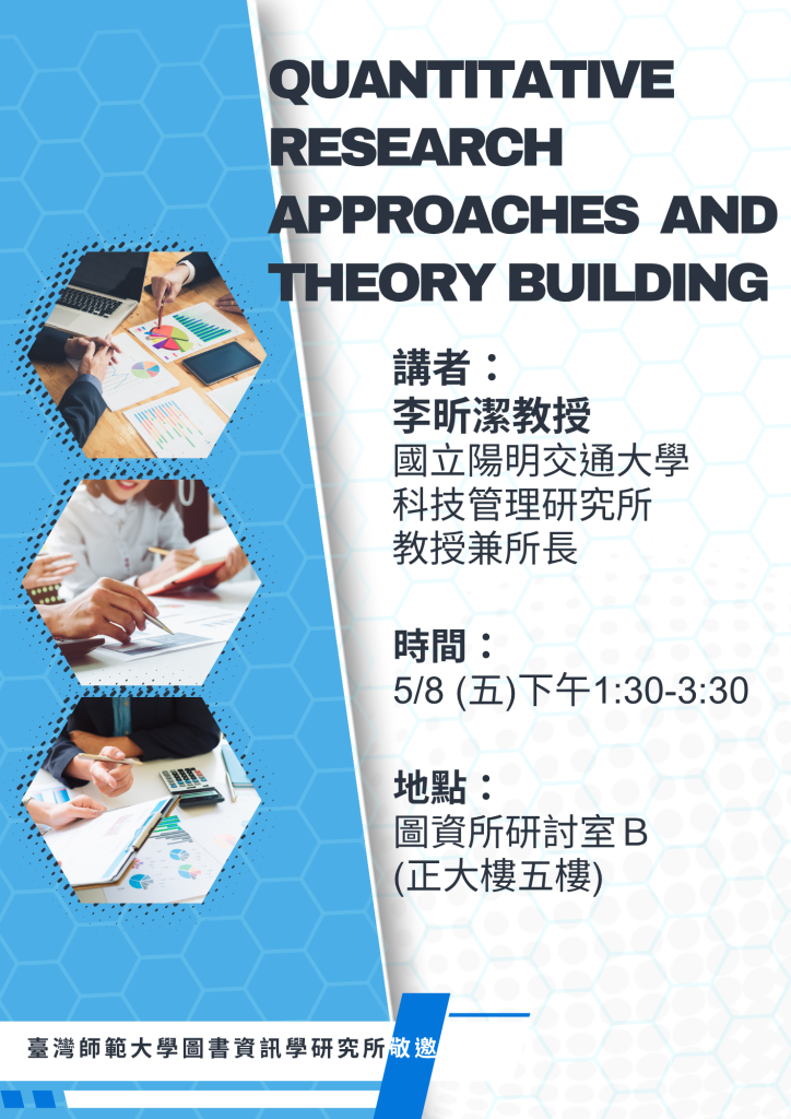 5/8(五)專題演講:Quantitative research approaches and theory building 演講主題:Quantitative research approaches and theory building講者:李昕潔教授國立陽明交通大學科技管理研究所教授兼所長 時間:5/8 (五)下午1:30-3:30 地點:圖資所研討室B(正大樓五樓) 註:本次演講為全英語授課,若非選修「理論建構」課程之學生欲旁聽,請與成維寧老師聯絡 臺灣師範大學圖書資訊學研究所敬邀 Post author:psshen Post published:2026-04-08